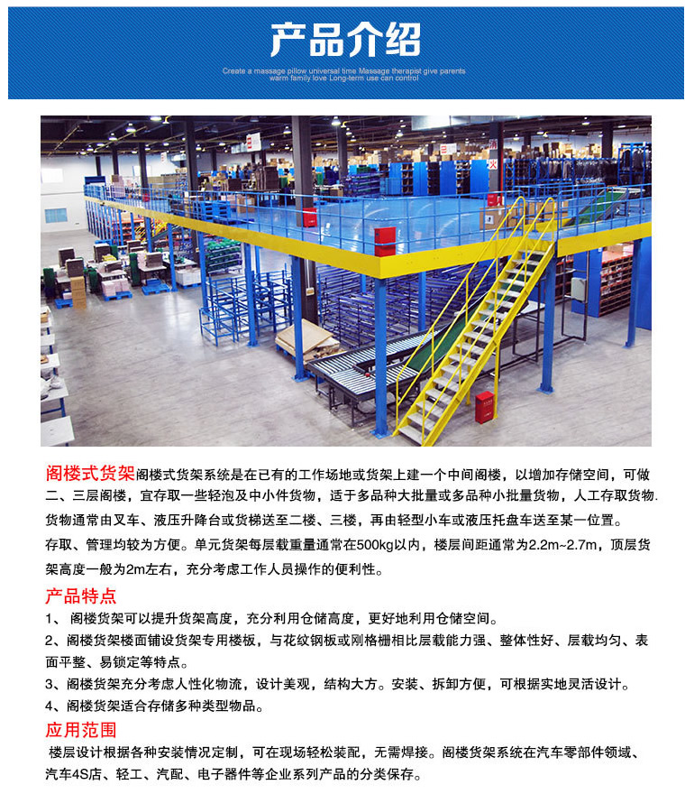 閣樓式貨架系統(tǒng)是在已有的工作場地或貨架上建一個中間閣樓,以增加存儲空間,可做二、三層閣樓,宜存取一些輕泡及中小件貨物,適于多品種大批量或多品種小批量貨物,人工存取貨物.貨物通常由叉車、液壓升降臺或貨梯送至二樓、三樓,再由輕型小車或液壓托盤車送至某一位置。 近幾年多使用冷軋型鋼樓板,它具有承載能力強(qiáng)、整體性好、承載均勻性好、精度高、表面平整、易鎖定等優(yōu)勢.有多種類型可選,并且易匹配照明系統(tǒng),存取、管理均較為方便。單元貨架每層載重量通常在500kg以內(nèi),樓層間距通常為2.2m~2.7m,頂層貨架高度一般為2m左右,充分考慮工作人員操作的便利性。 樓層設(shè)計(jì)根據(jù)各種安裝情況定制,可在現(xiàn)場輕松裝配,無需焊接。閣樓貨架系統(tǒng)在汽車零部件領(lǐng)域、汽車4S店、輕工、電子等行業(yè)有較多應(yīng)用。 閣樓式貨架的特點(diǎn) 1,閣樓貨架可以提升貨架高度,充分利用倉儲高度,更好地利用倉儲空間。 2、閣樓貨架樓面鋪設(shè)貨架專用樓板,與花紋鋼板或剛格柵相比層載能力強(qiáng)、整體性好、層載均勻、表面平整、易鎖定等特點(diǎn)。 3、閣樓貨架充分考慮人性化物流,設(shè)計(jì)美觀,結(jié)構(gòu)大方。安裝、拆卸方便,可根據(jù)實(shí)地靈活設(shè)計(jì)。 4、閣樓貨架適合存儲多種類型物品。 結(jié)構(gòu)與安裝方法 閣樓式貨架的結(jié)構(gòu)與安裝方法結(jié)構(gòu) 閣樓式貨架整體結(jié)構(gòu)為拼裝式,無須現(xiàn)場焊接,整體美觀、大方。與混凝土結(jié)構(gòu)或型鋼結(jié)構(gòu)相比,由于底樓貨架本身起到上面樓層的支撐作用,具有成本低、空間利用率高的優(yōu)點(diǎn)。 閣樓式貨架面板有平板、花紋鋼板、沖孔鋼板等品種以適應(yīng)防火、通風(fēng)、光照等等不同使用要求。貨物上下樓層可選擇叉車、液壓升降臺、貨梯等方式;貨物同層運(yùn)輸通常使用小型手推車完成。 閣樓式貨架通常承載能力在300KG~1000KG/平方米,立柱選擇承載能力強(qiáng)、用鋼量少的圓管;主次梁可以根據(jù)承載需要選擇目前在鋼結(jié)構(gòu)工程中較經(jīng)濟(jì)合理的H型鋼及薩克森公司開發(fā)的專用鋼平臺C型冷彎成型梁。 閣樓式貨架樓面板選用薩克森專用特殊C型冷彎成型花紋鋼板或鏤空板,采用扣板式結(jié)構(gòu),與主次梁鋼性固定,整個平臺結(jié)構(gòu)整體性強(qiáng),可以根據(jù)實(shí)際需要選擇不同的樓面板以滿足消防或防灰塵、防小件墜落要求。樓面下方也可根據(jù)需要配置照明系統(tǒng)。 閣樓式貨架廣泛應(yīng)用于庫房較高、貨物較小、人工存取、存儲量較大的情況下,可充分利用空間,節(jié)約庫房面積。根據(jù)實(shí)際場地和具體要求,可設(shè)計(jì)成單層或多層閣樓,一般為2-3層。特別適用于汽配、電子器件等企業(yè)系列產(chǎn)品的分類保存,承載≤500kg/層。
