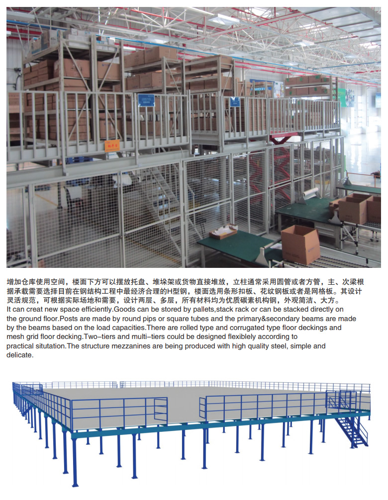 組成:平臺結構通常由鋪板、主次梁、柱、柱間支撐,以及梯子、欄桿等組成。 分類: 鋼結構平臺(3層) -按使用要求可分為室內和室外平臺,承受靜力荷載和動力荷載平臺、生產輔助平臺,以及中、重型操作平臺等。 -按照支座處理方式的不同,平臺結構還可分為: 直接擱在廠房柱的三角架或牛腿上的平臺,功能通常為安全通道或為一種簡單的中型操作平臺。 一側支撐于廠房柱或建筑物墻體,另一側設獨立柱的平臺。 支撐于大型設備上的平臺。 全部為獨立的平臺。 對受有較大動力荷載或有重量很大設備的平臺,宜與廠房柱脫開設計,直接支撐于獨立柱上。