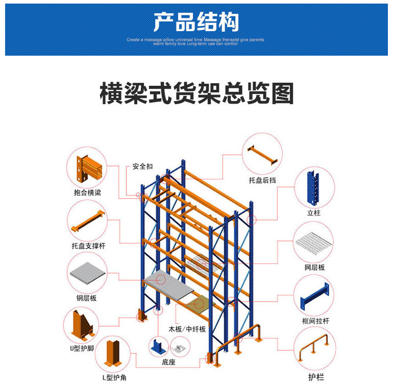 重型貨架,又俗稱橫梁式貨架,或稱貨位式貨架,屬于托盤貨架類,在國內的各種倉儲貨架系統中較為常見一種貨架形式。以立柱片+橫梁形式的全組裝結構,結構簡明有效。可根據存儲單元集裝設備的特性加裝如:隔檔、鋼層板(木層板)、金屬絲網層、倉儲籠導軌、油桶架等功能性附件。滿足不同單元集裝設備形式的貨物存儲。